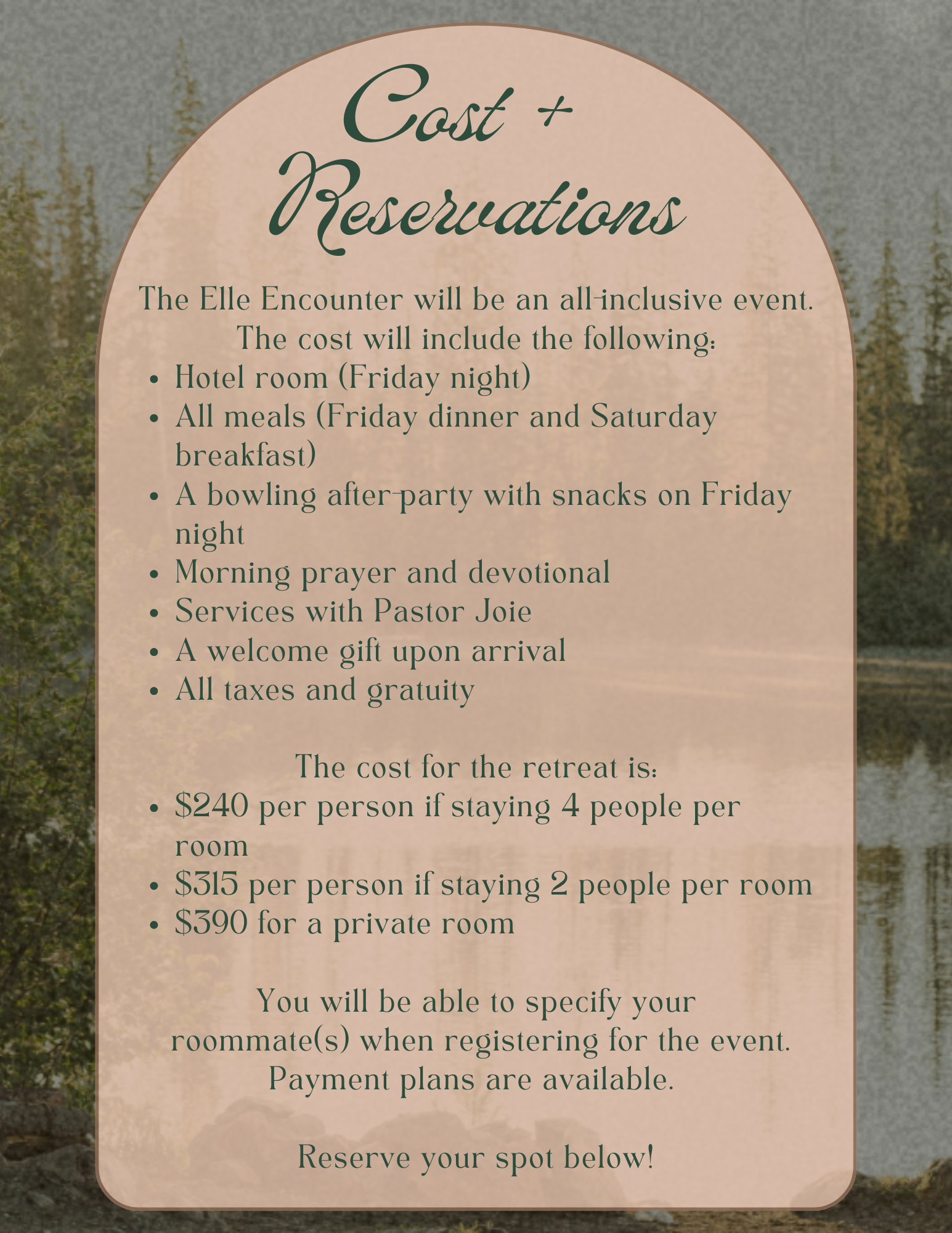 Join us for our annual Elle Encounter on October 10th-11th, 2025! You’ll enjoy services with Pastor Joie and the Elle Worship Team, morning prayer, and plenty of time to relax and enjoy the facility.